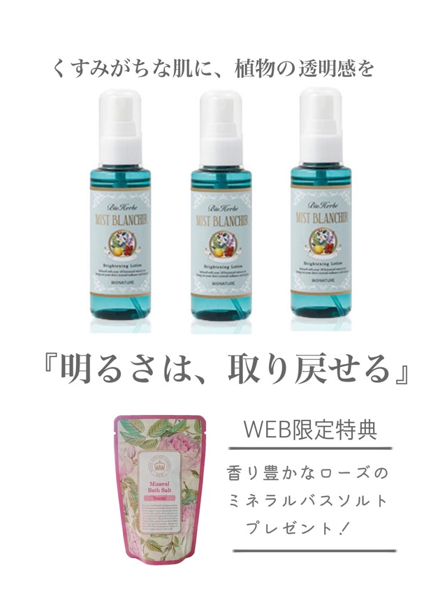 素肌に優しい、けれどしっかり美白ケアができる 美白化粧水ミスト、お得な3点セット! web shopからの岡 お買い物特典として 香り豊かなバスソルト現品(¥770) をプレゼント‼︎ 日々のスキンケアに、 手軽に美白効果をプラス! 美白ミストブランシールは、 厳選されたハーブと植物エキスをベースにした 美白に特化した化粧水です。 シミやくすみが気になる方 お仕事で屋外にいることが多い方 日中、車の運転をされる方 は、特におすすめです。 現代の強い紫外線からは 逃げられませんので 朝晩のケアで 少しでも、紫外線ダメージを 軽減できますように! 美肌へ導きます。 【オススメポイント】 ①美白成分がしっかり浸透し、透明感のある肌へ ②ハーブの力で肌をリフレッシュ、疲れた肌にうるおいを与えます ③アロマテラピー効果で心までリラックス♪ ④使い方は簡単!いつもの化粧水の前にプッシュ! 【使用方法】 普段お使いの化粧水の前に 5〜7プッシュを 顔〜首へふりかけ よくなじませてから いつもの化粧水を 美白ミストブランシールは あなたの美しさを引き出すお手伝いをいたします!