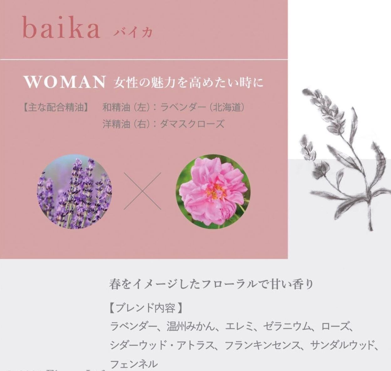 ・配合精油:ラベンダー、温州みかん、エレミ、ゼラニウム、ローズ、シダーウッド・アトラス、フランキンセンス、サンダルウッド、フェンネル